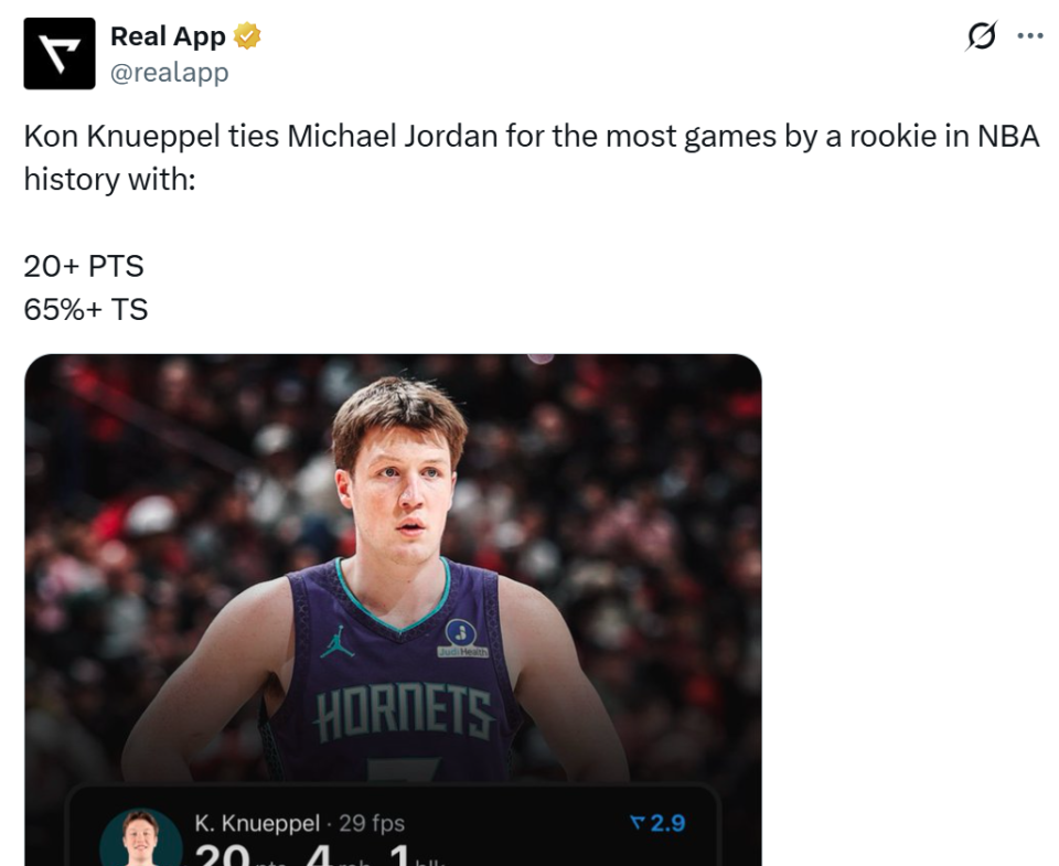 这已经是克努佩尔新秀赛季至今第26场,至少以65%的真实命中率砍下20+得分表现,成功追平乔丹保持的神纪录,按照克努佩尔的表现与剩余场次他反超乔丹只是时间问题。